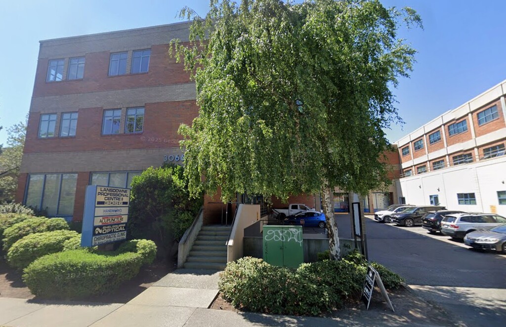 The Landsdowne Professional Centre is located on the southwest corner of the Shelbourne Street and Hillside Avenue intersection, across the street from Hillside Shopping Centre; there are three gas stations at the other three corners of the intersection. The centre is two buildings connected by a corridor. We are in the Landsdowne Professional Building II off Shelbourne, behind Building I where the Pharmasave is. You can get through either side of the building via the connecting corridor, and the underground parking is connected.