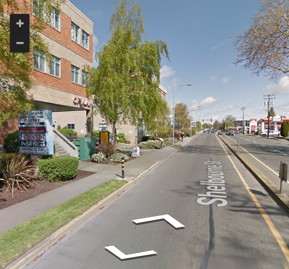 On Shelbourne Street, facing the intersection of Hillside Avenue and Shelbourne Street.